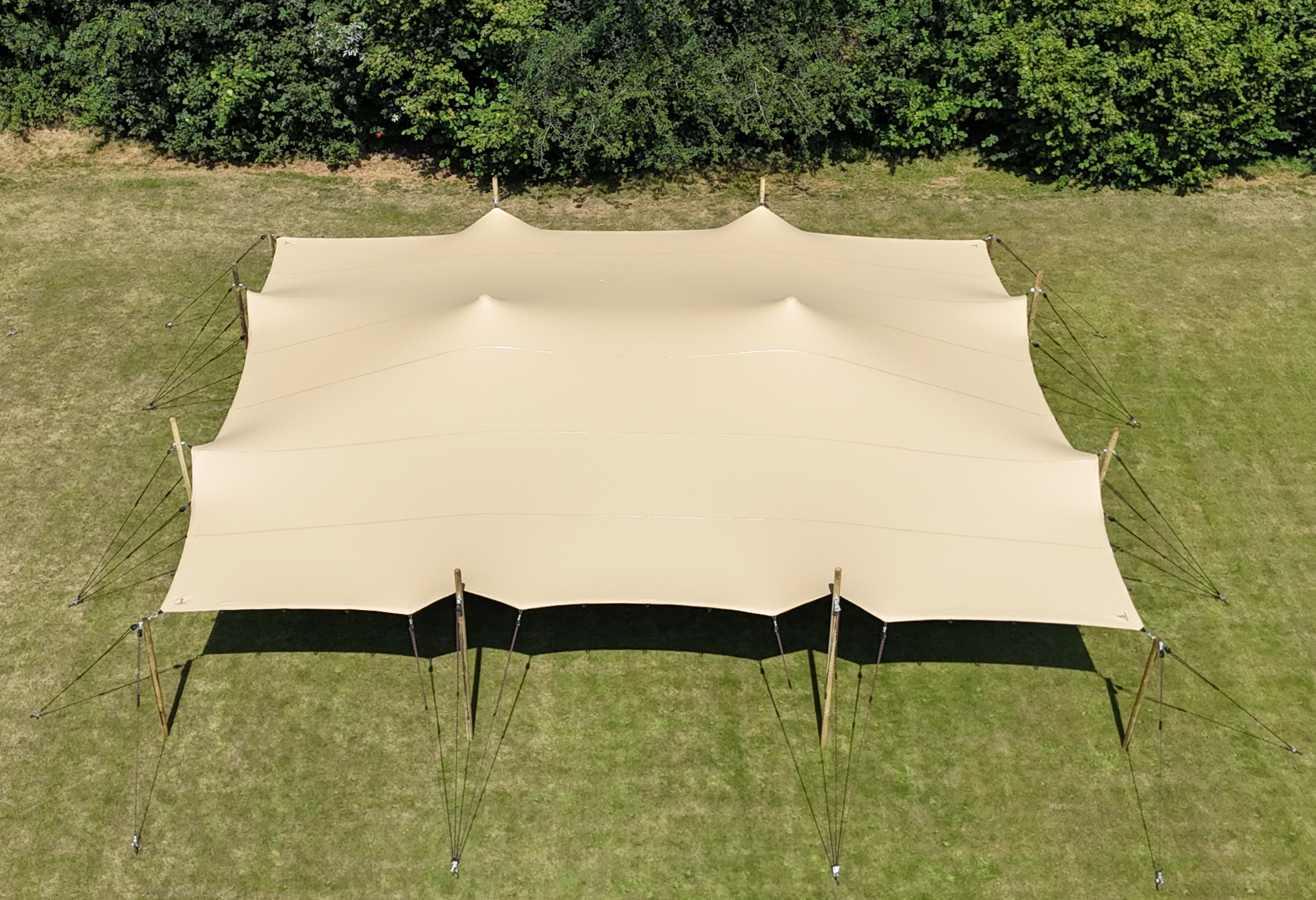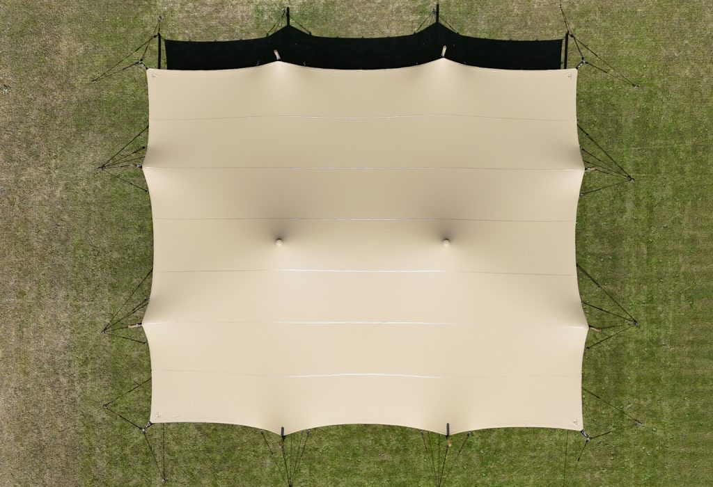 Nasze namioty rozciągliwe są produkowane z wyjątkową dbałością o szczegóły i jakość. Tkanina 720 g/m² jest jednostronnie powlekana i posiada technicznie zaawansowane wykończenie tekstylne od spodu, opracowane wyłącznie przez nasz wewnętrzny zespół. Ta kombinacja wysokiej jakości materiałów i tkanin ognioodpornych gwarantuje trwałe i bezpieczne rozwiązanie, zapewniając komfort i spokój podczas Twojego wydarzenia.