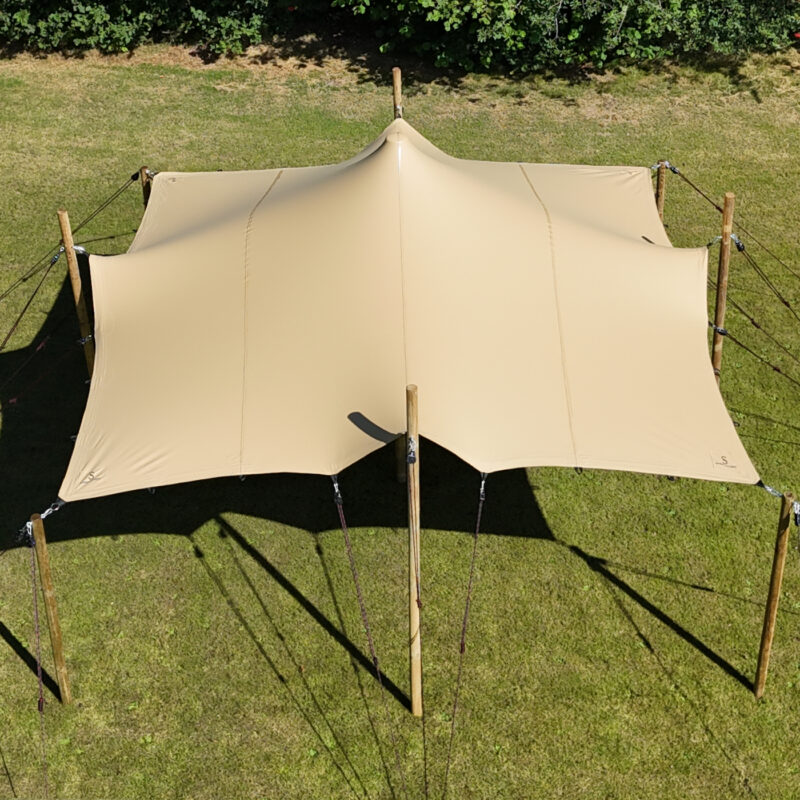 Dale a tu evento, fiesta, patio o jardín un toque veraniego y mediterráneo con esta carpa elástica de 5 x 5 m, también conocida como carpa nómada. Gracias a su tejido elástico de alta calidad (720 g/m²) y a los postes incluidos, puedes personalizar su configuración: con buen tiempo, puedes montarla con los cuatro lados abiertos; con viento, con uno o más lados cerrados; y con lluvia, puedes montarla casi completamente cerrada. Cuanto más grande sea tu carpa, más posibilidades tendrás.